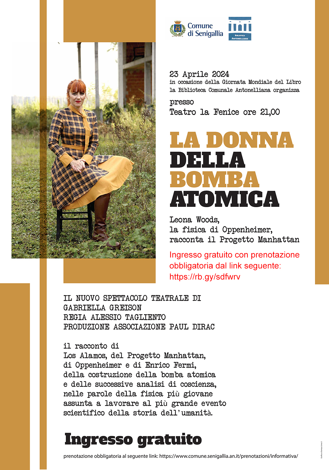 Martedì 23 aprile ore 21,00 presso il Teatro La Fenice Senigallia - Presentazione del libro "La donna della bomba atomica" di e con Gabriella Greison Gabriella Greison – spettacolo teatrale tratto dall’ultimo libro “La donna della bomba atomica”