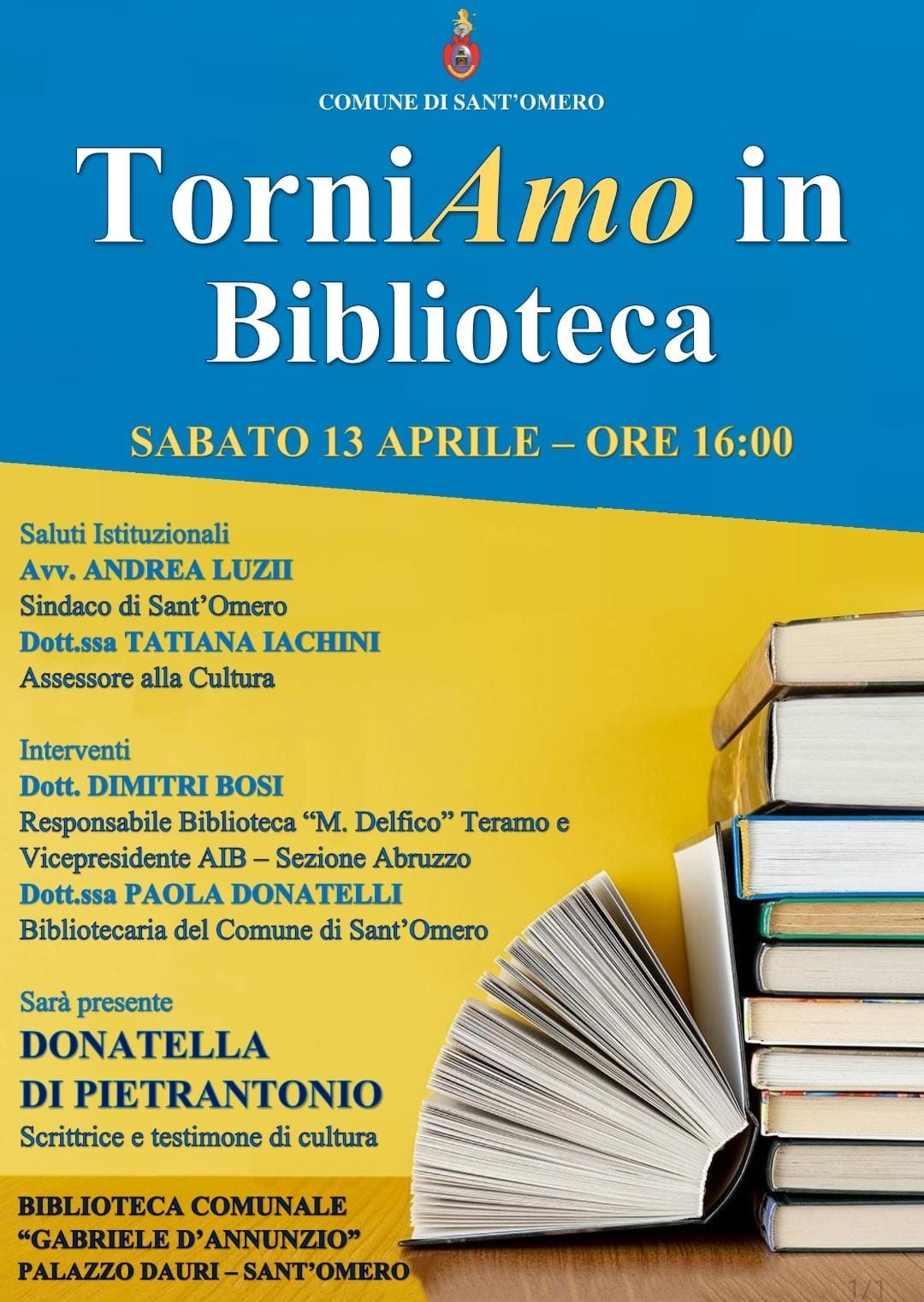 La Biblioteca Comunale “Gabriele D’Annunzio” aderisce per la prima volta a “Il Maggio dei Libri”, essendo stata riaperta al pubblico, dopo un periodo di inattività, sabato 13 aprile 2024. A tagliare il nastro, oltre alle autorità istituzionali, anche la scrittrice Donatella Di Pietrantonio. In occasione della “Giornata mondiale del Libro” e come ade-sione al terzo filone della campagna “Lib(e)ri di creare” dedicato al genere poetico, l’istituto culturale “dona” ai suoi utenti – lettori una delle poesie più celebri del Vate.