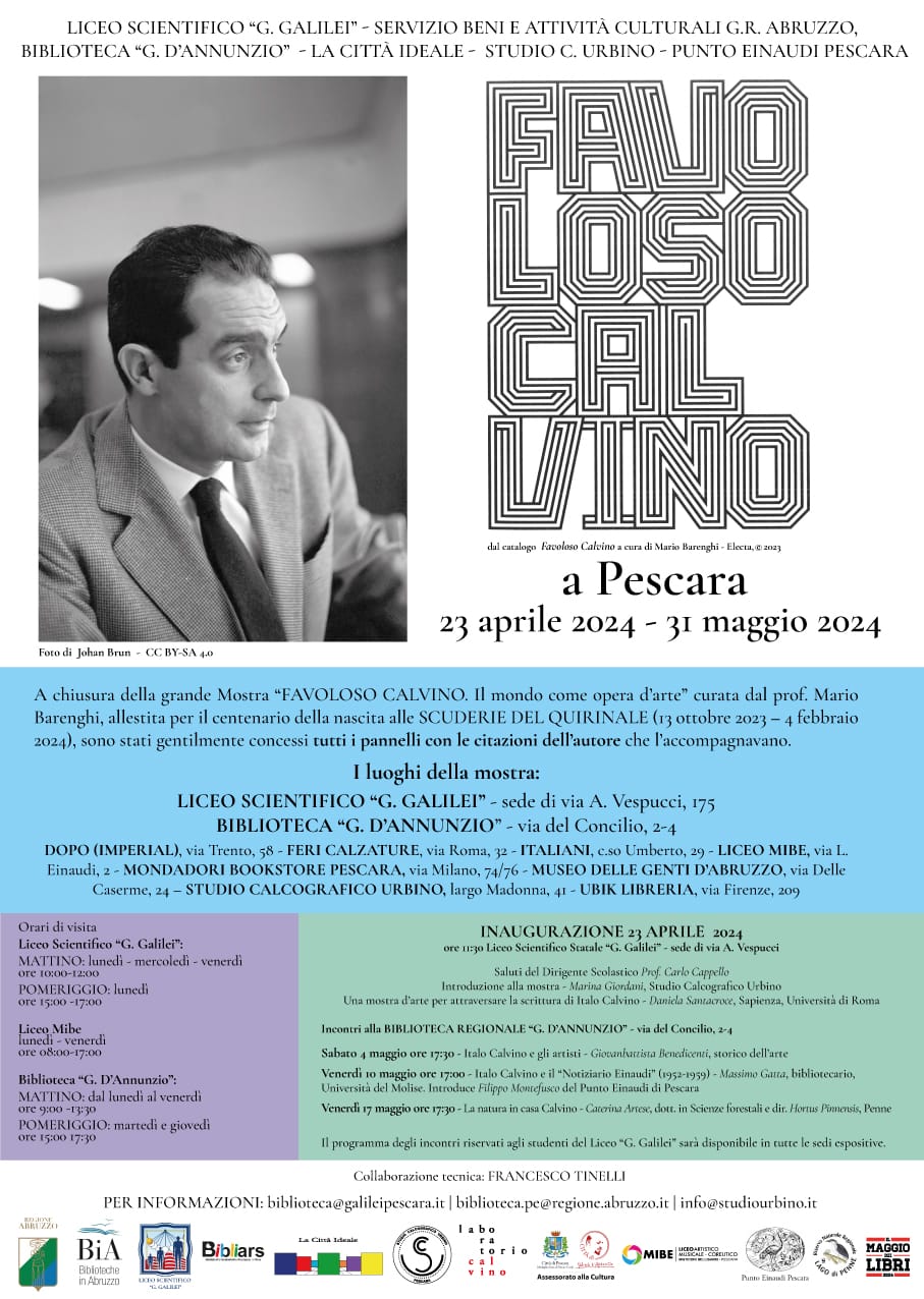 Mostra dedicata ad Italo Calvino: 'esposizione di alcuni pannelli con citazioni dell'autore provenienti direttamente dalla mostra "Favoloso Calvino. Il mondo come opera d'arte" che si è tenuta alle Scuderie del Quirinale in occasione del centenario della nascita dell' autore. (per gentile concessione degli organizzatori).