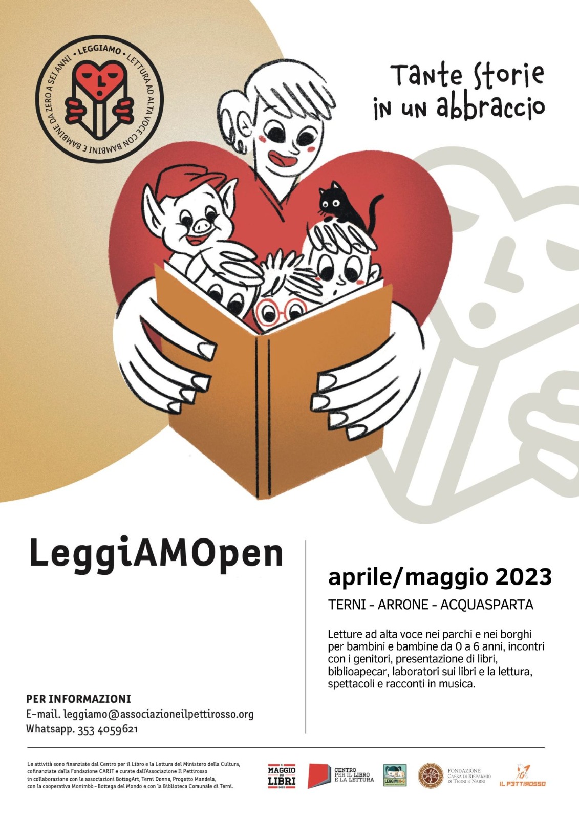 LeggiAMOpen è la versione "outdoor", specificamente pensata per "Il Maggio dei Libri", del più articolato progetto "LeggiAMO" dell'associazione Il Pettirosso (in collaborazione con altre associazioni partner), dedicato alla lettura a voce alta in età 0-6 anni e attivo sul territorio ternano da settembre 2022.